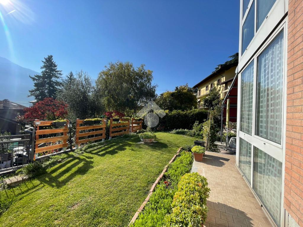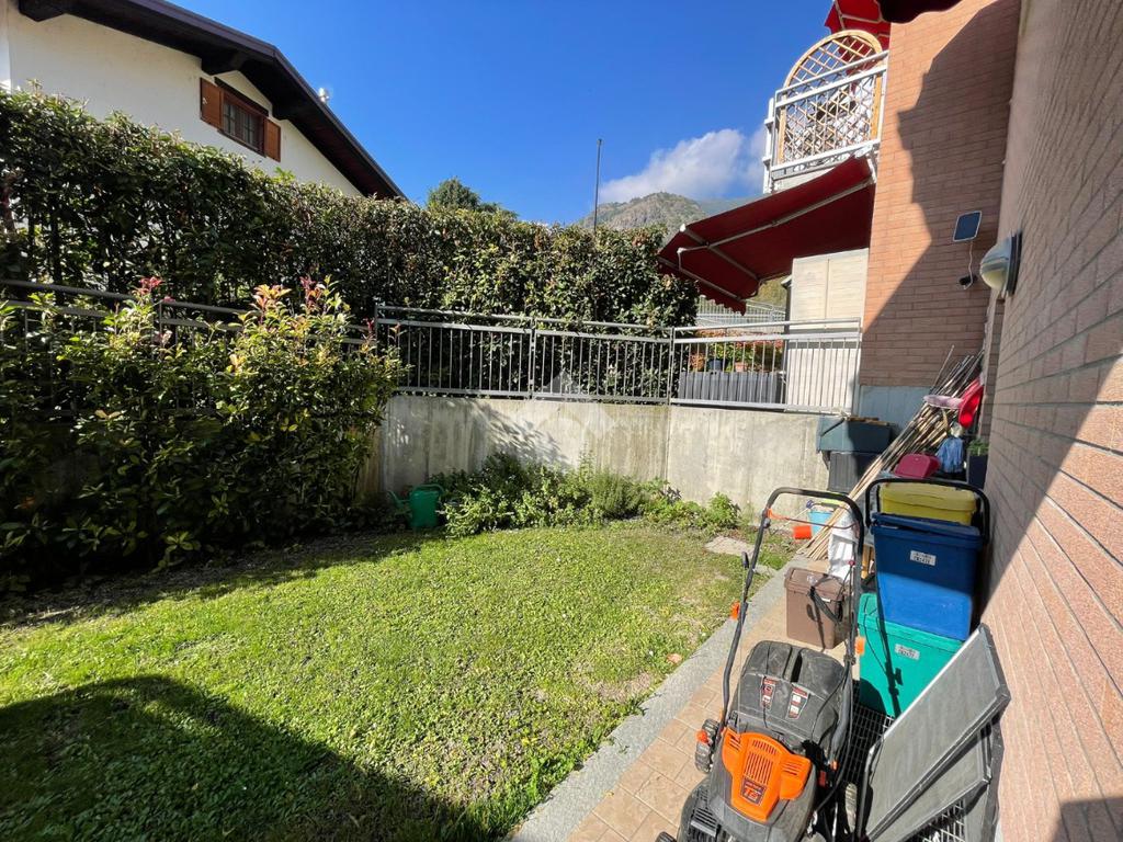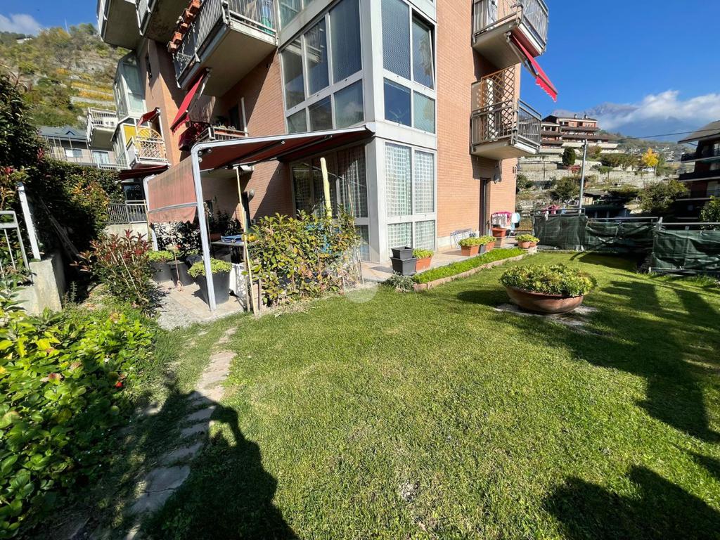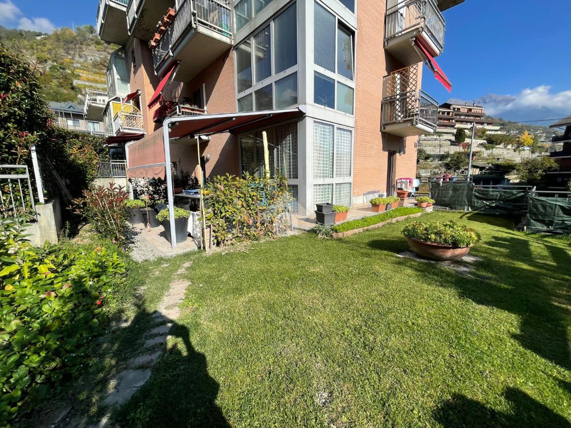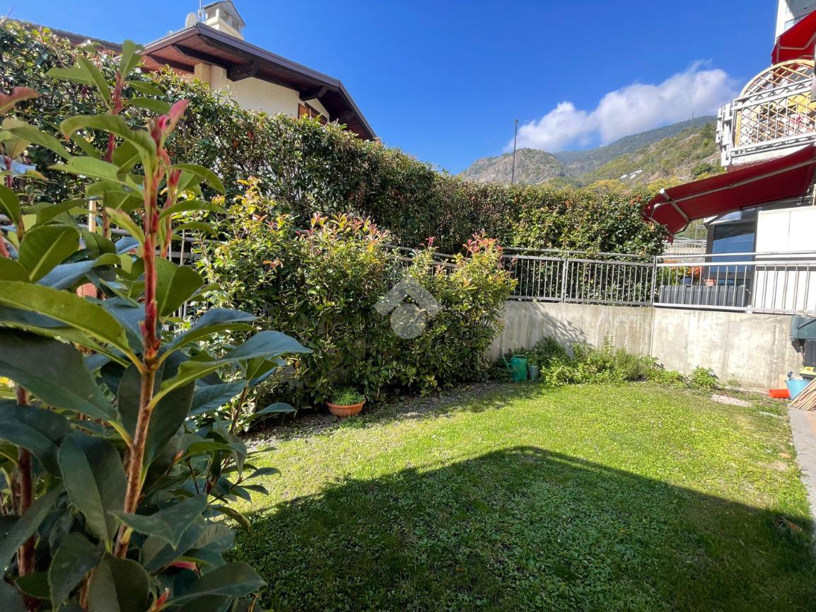 Aosta, Via delle Betulle, in zona panoramica e soleggiata. L'alloggio è in un contesto di 7 unità abitative costruito nel 2008. L'alloggio è al piano terra con area verde ad uso esclusivo. Il soggiorno è unito alla cucina con l'uscita diretta sull'area verde con terrazzino e orto a sud-ovest. Dalla zona giorno si accede alla serra bioclimatica adibita a soggiorno a vista sul giaridno. La zona notte ospita una camera matrimoniale con cabina armadio e con l'uscita diretta sul giardino a sud. La seconda camera ha l'uscita sul balcone a est e il bagno con doppio lavabo e ampia doccia. Completa l'unità tre posti auto doppi con colonnina elettrica privata, box auto di 28 mq con all'interno l'attacco alla colonnina elettrica. Il riscaldamento è autonomo a metano. Le spese condominiali sono pari a 1500,00€.
